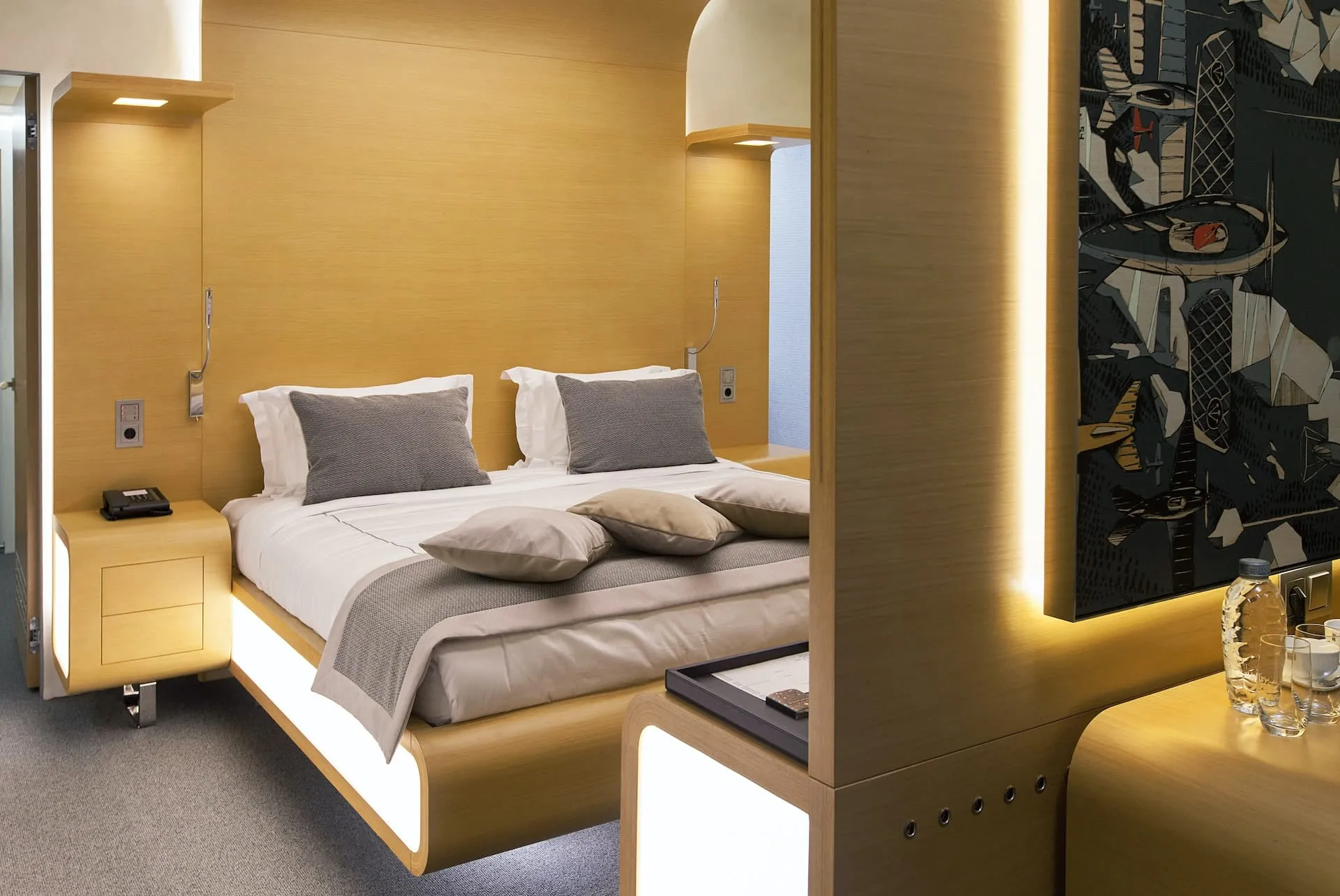 Просторная двуспальная кровать King встроена в индивидуальный дизайнерский корпус–капсулу с многоуровневой подсветкой. Также в распоряжении гостей имеются номера с двумя раздельными кроватями для комфортного размещения. Каждый номер украшен панно, выполненным московским художником Станиславом Трацевским специально для дизайн-отеля "СтандАрт".
